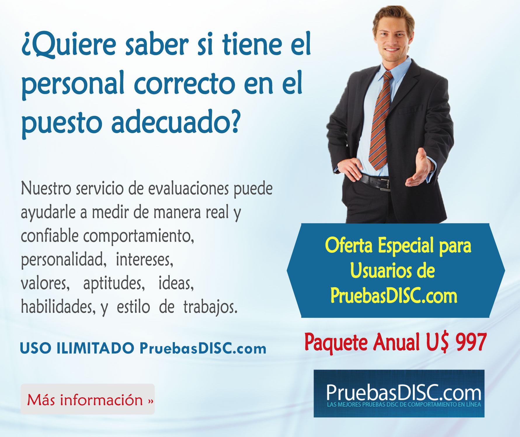 Santo Domingo, Republica Dominicana: 25 de Octubre PruebasDISC y 26 de Octubre www.SoftwareRecursosHumanos.com. Horario de 9am a 6pm. Lugar: Hotel Barceló.